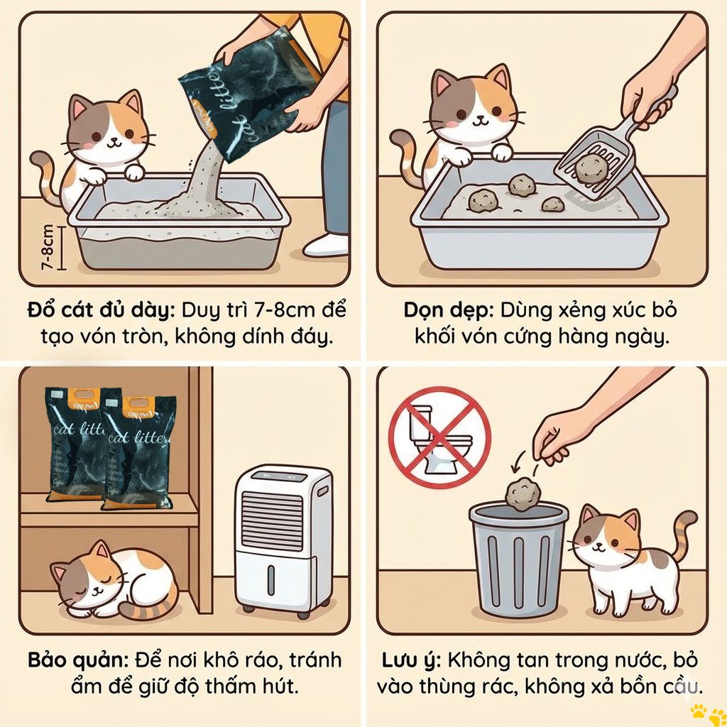 Đổ cát đủ dày: Duy trì lượng cát trong khay ở độ dày từ 7-8cm. (Cát đất sét cần độ dày để tạo khối vón tròn đẹp mà không dính đáy).